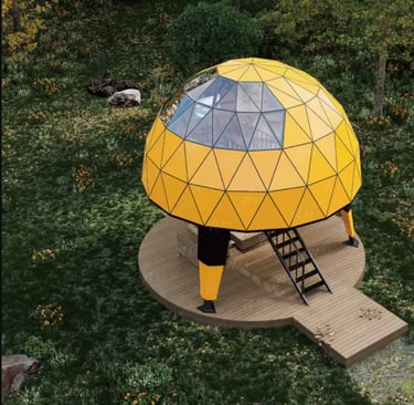 Structure géodésique arrondie, volumes fluides, isolation naturelle, intérieur lumineux et modulable, esthétique futuriste mêlée au minimalisme organique.
